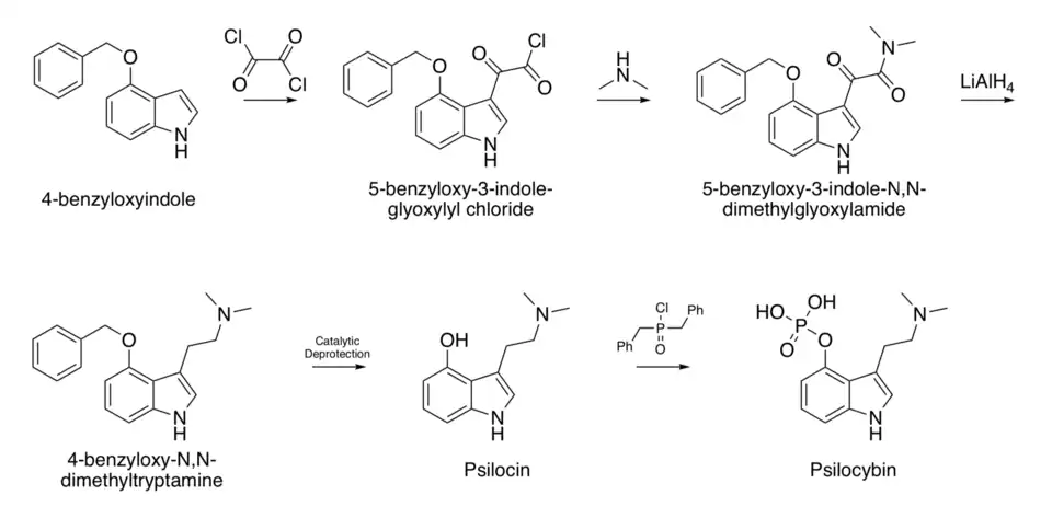 Psilocybin (4-phosphoryloxy-N,N-dimethyltryptamine), a naturally occurring serotonergic compound, is one of the main psychoactive compounds found in a group of hallucinogenic fungi of the genus psilocybe, often referred to as "magic mushrooms" (Studerus et al., 2011). See list of psilocybin mushroom species. These mushrooms belong to group of drugs called psychedelics, currently considered a controlled substance in most countries. See legal status of psilocybin mushrooms. In low doses, psilocybin dramatically alters a person's perception of reality in unpredictable ways, through cognition, mood, thoughts, emotion and sense of self. Effects typically last between 2 and 8 hours depending on dosage (Dinis-Oliveira, 2017).