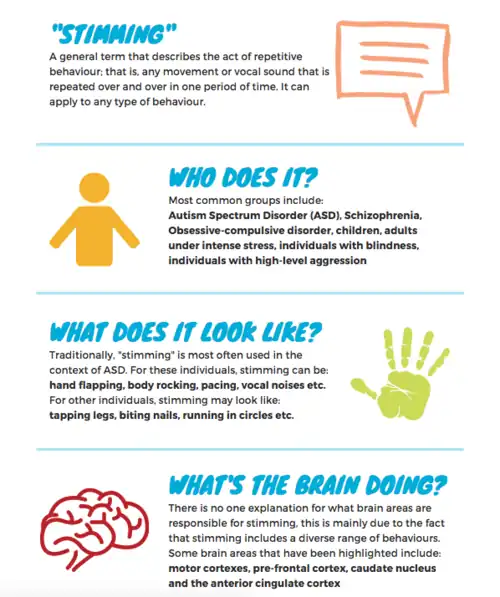 The term "stimming" is a form of positive terminology embraced by the autism community (Kapp et al., 2019). This term encompasses a wide variety of repetitive motor and verbal behaviours (Joosten, Bundy, & Einfeld, 2012). Longitudinal research suggests that stimming can be emitted by neurotypical and clinical groups of people; "neurotypical" meaning the absence of developmental or psychological disorders (Leekam et al., 2007). Figure 2 provides a snapshot of the information in this section: what is stimming, who uses stimming, what stimming looks like and what brain mechanisms might be involved in stimming.