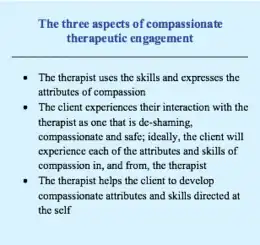 Compassion focused therapy can be helpful to those who find it hard to understand, feel or express compassion towards themselves and others. Experiencing or demonstrating compassion may be daunting to those individuals. CFT therapy can be a safe place to uncover the causes behind this difficulty and discover methods of positive change. CFT can also be effective and successful in helping individuals handle distressing thoughts, behaviours and feelings. CFT can be especially helpful when coping with self attack related feelings (Braehler, 2013). Three aspects of therapeutic engagement have been displayed in image 4. This can give us an indication about what happens in a clinical setting with a therapist.