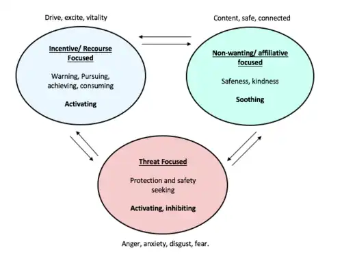Paul Gilbert's evolutionary model proposes that humans beings switch between three systems to manage their emotions. Each system is associated with different brain regions and different brain chemistry, Distress is caused by an imbalance between the systems, often associated with under-developed of the soothing system (Bloomfield, 2015).