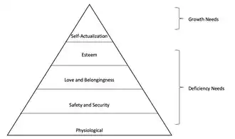 Unlike Maslow's suggestion, needs do not need to be satisfied in order from bottom to top as growth is not linear. There is empirical evidence for a two-level hierarchy of deficiency needs and growth needs (Wahba & Bridwell, 1976; Sheldon et al., 2001). The two level hierarchy condenses the physiological, safety, belongingness, and esteem needs into the single category of deficiency needs. The self-actualisation need becomes the growth needs. The two-level hierarchy abolishes the notion that needs are to be satisfied in order from bottom to top. It also provides a clear distinction of what is needed to move on to growth needs (Wahba & Bridwell, 1976; Sheldon et al., 2001; see Figure 1).