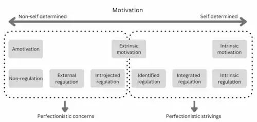 Linking perfectionistic concerns and strivings into this model (see Figure 3) demonstrates how perfectionistic concerns are associated with a less self-determined self where the individual is motivated by extrinsic rewards and obligations. Conversely, perfectionistic strivings are linked to an individual being more self-determined where the individual is driven by intrinsic rewards, enjoyment, and personal satisfaction. This model simplifies the research findings indicating that perfectionistic concerns are positively correlated to amotivation (Barcza-Renner et al., 2016), meaning perfectionism in terms of concern for making mistakes, self doubt, and parental expectations/criticism can lead to reduced motivation, where initiating and persisting with goal directed behaviour is diminished.