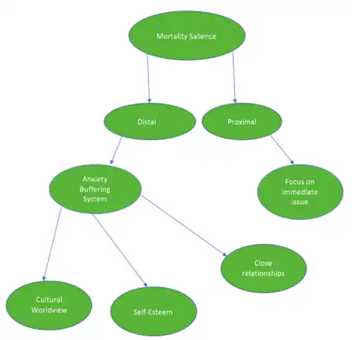 Terror management theory proposes that humanity is an innate capability of self-protection, a significant distinction between humans and other creatures (Greenberg et al., 1997). This theory believes that self-esteem and culture is an excellent buffer to prevent anxiety (Du et al., 2013) of decreasing the relevant cognition of death and asserting that any complex social behaviour needed to indicate consideration of death-denying factor under a cultural worldview (Greenberg et al., 1997). Pyszczynski believes that behaviour that increases an individual's self-esteem in a particular culture might lead to self-abasement in another culture. For example, cheek-kissing in some countries is reasonable and shows respect to other people, yet it is unacceptable to cheek-kiss unknown people in some cultures. This concept ensures an individual's self-esteem through actions under a specific social role's adaption or to achieve social standards. A study shows that self-esteem can decrease death anxiety (Greenberg et al., 1992). The researcher believes that, to an extent, cultural aspects would contribute to preventing anxiety of death through achieving a confident societal expectation to improve self-esteem. See figure 5 for more information.