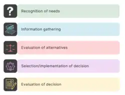The decision-making process involves evaluation between one's needs and ways to fulfill them (see Figure 2).[4] Because each choice has several factors to be considered, there are typically no perfect alternatives that satisfy every single one of those aspects, making it harder to choose.[4] The quality of the decision-making process can be influenced by a range of things, one of which is the emotional state.[5] Too many choices can overwhelm the mind's capacity to make good judgements.[6] By telling us what one prefers, emotions can filter out the less desirable options, and reduce the workload of the mind.[5]