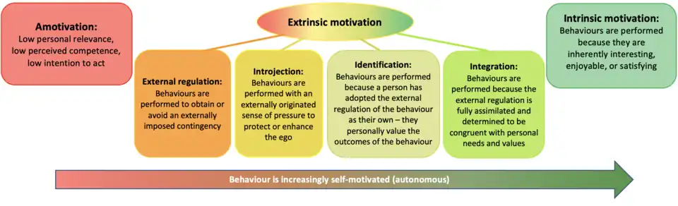 The self-determination theory (SDT) differentiates between controlled motivation and autonomous motivation (Gagné & Deci, 2005). These sit on a continuum starting with amotivation, and then progressively internalising the extrinsic motivations will lead to greater autonomy (Gagné & Deci, 2005; Figure 2). Being fully autonomous or intrinsically motivated involves acting of one's own volition and having a choice to do so (Gagné & Deci, 2005). To be self-determined is to have these three psychological needs satisfied: competence, relatedness, and autonomy (Gagné & Deci, 2005).