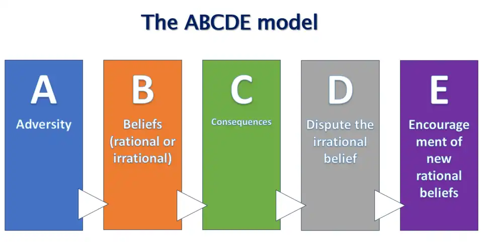 REBT seeks to help people who experience emotional disturbances and help them achieve their goals (Bernard et al., 2010). To do so, the theory suggests that it is necessary to develop people's potential for rationality by helping them practice rational principles of living, with a focus on short-term goals (Bernard et al., 2010). The ABCDE model represents REBT's central idea for treatment, as it empowers clients to dispute their irrational beliefs (see Figure 3) (Bernard et al., 2010). According to the model, when people are confronted with adversities (A), they can either choose to hold rational or irrational beliefs (B), which can lead to healthy or unhealthy consequences (C) (Ellis, 2008). When seeking therapy, individuals are asked to dispute (D) their irrational beliefs and are encouraged (E) to replace their irrational beliefs with rational ones (Turner et al., 2020). Turner et al. (2020) applied the ABCDE model to a group of amateur golfers with the goal of decreasing irrational beliefs, which can often lead to performance anxiety. The study found that, after the intervention, all golfers displayed a decreased number of irrational beliefs and anxiety (Turner et al., 2020). Moreover, data collected after one month from the intervention, showed persistence in the study's initial results, further suggesting that REBT can lead to long-term change (Turner et al., 2020). However, the study also acknowledges that there are several areas for improving how the effectiveness of the ABCDE model is assessed, as longer and more detailed interventions may be able to not only be more affective, but also evaluate changes over time (Turner et al., 2020).