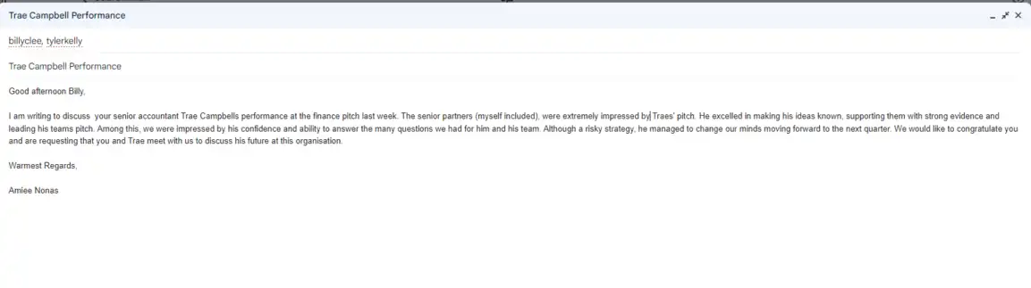 After Trae met with Billys supervisor Amiee, he was told that he would be given a much more important role within the organisation. He was told that the new role would come with many responsibilities and benefits including increased pay, higher level of recognition, more organizational power and a new pristine office. Trae is super excited for the role and will stop at nothing to maintain his position. He aims to avoid wasting resources and costing the firm any extra money to maintain his position.