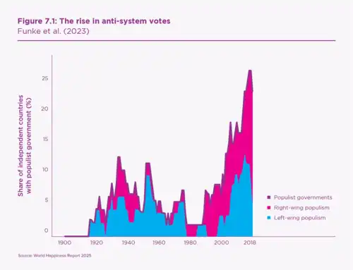 As reported by the WHR 2025 there has been a decline in trust in government and institutions. This issue of social trust in Europe and the United States has led to a rise of polarisation of political values and anti-system voting. This trend can be seen in figure 11.