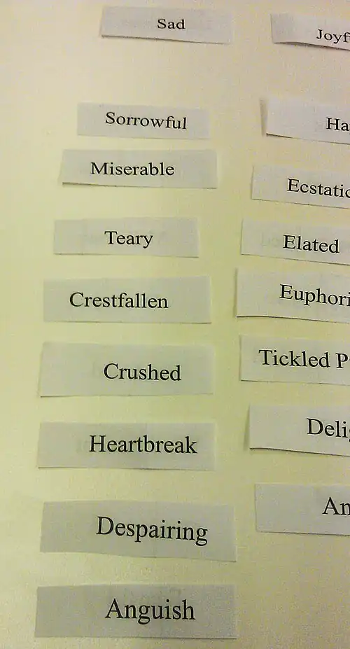This core emotion sort exercise is also designed to expand "emotion knowledge", which is the "number of different emotions any one person can distinguish" (e.g., various shades of anger) which is part of emotional literacy and emotional intelligence. Emotion knowledge can be improved by expanding one's linguistic repertoire for describing emotions. Reeve (2009, p. 353) suggests that "the finer and more sophisticated one's emotion knowledge is, the greater his or her capacity to respond to each life event with a specialised and highly appropriate reaction".