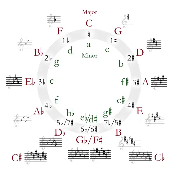 Some of the key signatures are enharmonic with each other: D♭ is enharmonic with C♯, G♭ with F♯, and C♭ with B. To better understand this, take a look at the circle of fifths, with shows each of the key signatures, which major or minor key it may represent, the number of sharps or flats it contains, and which keys are enharmonic.
