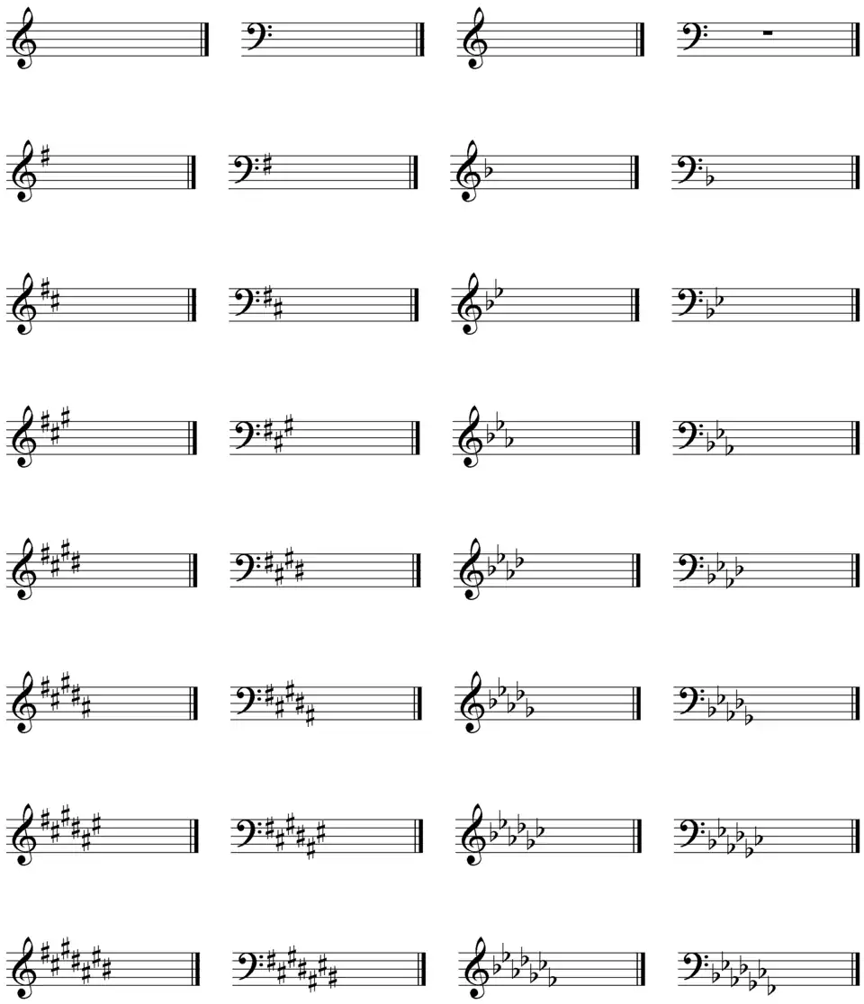We have eight sharp key signatures and eight flat key signatures. They look like the following: