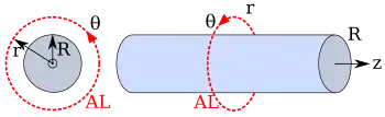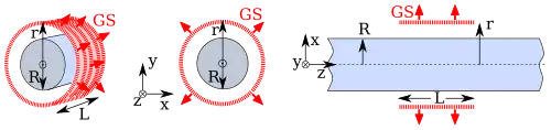 In cylindrical coordinates a symmetry exists if the field variables do not depend on or . This requires that the system extend to infinity in both directions on the z-axis. In the case of a charged cylinder, we may use a Gaussian Surface that is a cylinder of finite length, . Such a cylinder has three distinct surfaces: A hollow cylinder with a curved surface of length , and two flat circular discs at each end of the same radius. But if the field is in the radial direction only, there is no flux through the two ends.