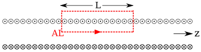 At this point, we postulate that the magnetic field away from the edges of a long, thin solenoid is significant only inside the solenoid, and that the magnetic field is parallel to the axis. Our Ampere's loop is a rectangle with four sides, but contributes to the integral only for a length inside the solenoid. Defining to be the number of turns per unit length, we have: