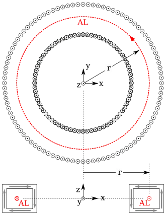 where is the speed of light in vacuum. The line integral associated with Ampere's law is marked in red and denoted by in the figures to the right. The right hand rule identifies the direction of the differential area element In contrast with the situation in Gauss's law, where the Gaussian surface uniquely defines the volume, the surface integral is valid for any smooth surface that has the Ampere's loop as its boundary (for example the top and bottom surfaces in the column to the right have the same boundary, which is a circle.) Since we are mostly interested in using these integral laws to quickly calculate electromagnetic fields for simple geometries, we will usually integrate over flat surfaces.