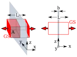 The charged object is shown as a thin sheet that extends between . First we apply Gauss's law for a field point outside the charged sheet. The GS is the six-sided box with area and length as shown in the figure. But since the electric field is in the x-direction, our surface integral involves only the two faces of area Since these faces have opposite outward unit normals, the sum of the fluxes becomes a difference in electric fields: