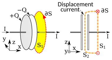 boundary. The surface is the area of the circle defined by , and it is pierced by an actual current shown in the figure. But if the surface is deformed into it instead goes through the capacitor, where a time-varying electric exists, but no current is present. Maxwell concluded that another way to generate a magnetic field was to have a time-varying electric field be present in the surface integral. Hence, he postulated that: