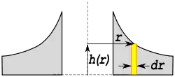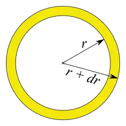 The figure shows two identical cross-sectional areas that can be integrated as, , but this step would be premature. Instead we sweep the rectangle of differential (small) area around the circumference to obtain the differential volume: