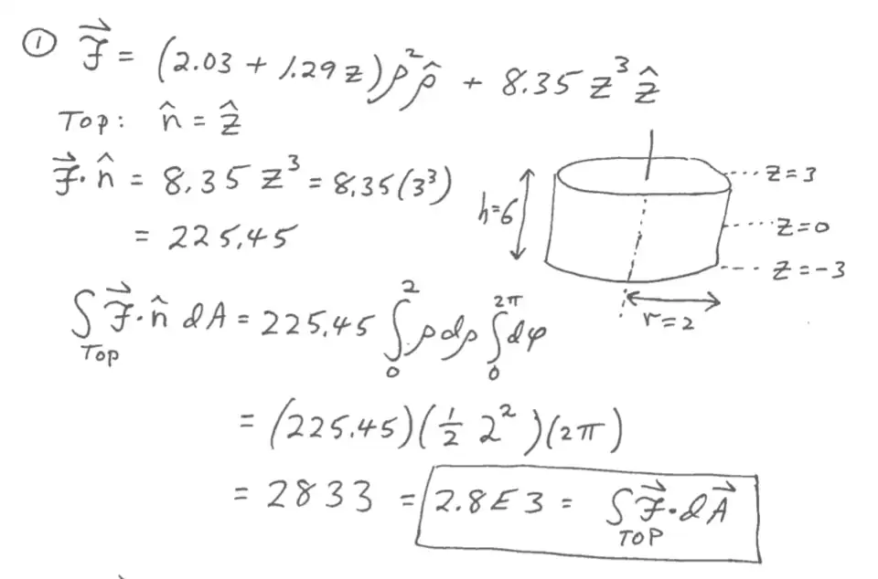 Review of dot product and a reminder that unit vectors are orthogonal and have unit magnitude. Since we are in cylindrical coordinates, we use for distance to the axis to avoid the use of in spherical coordinates. Define the vector area differential element using the outward unit normal . From the top down, we see the top of the cylinder in what looks like polar coordinates. On the top circle have a Also shown in is the curved side of the cylinder. Here the dimensions of the small rectangle are such that . |