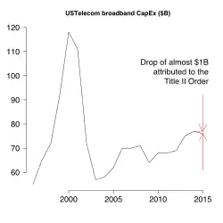 The drop in 2015 CapEx sounds big at almost a billion dollars but is less than three quarters of the annual changes since 1996. This is visible in the accompanying plot of U.S. Broadband CapEx investment, cited but not plotted in the Notice of Proposed Rulemaking (NPRM) on "Restoring Internet Freedom" published May 18 by Trump's FCC.[26] The damage they claim does NOT make sense if one actually looks at the available data.