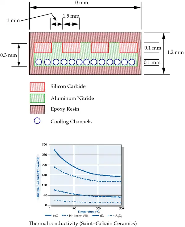 The thermal conductivity of the silicon carbide and the aluminum nitride are also given in Figure 1. The thermal conductivity of the epoxy resin is 1.5 W/m-K.