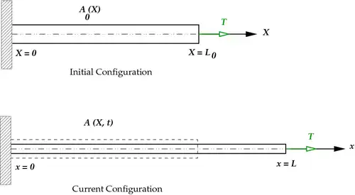 In the reference (or initial) configuration, the bar has a length , an area , and density . A tensile force is applied at the free end. In the current (or deformed) configuration at time , the length of the bar increases to , the area decreases to , and the density changes to .