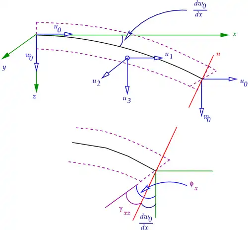 {\displaystyle {\begin{aligned}\varepsilon _{xx}^{0}&={\cfrac {du_{0}}{dx}}+{\frac {1}{2}}\left({\cfrac {dw_{0}}{dx}}\right)^{2}\\\varepsilon _{xx}^{1}&={\cfrac {d\varphi _{x}}{dx}}\\\gamma _{xz}^{0}&=\varphi _{x}+{\cfrac {dw_{0}}{dx}}\end{aligned}}}