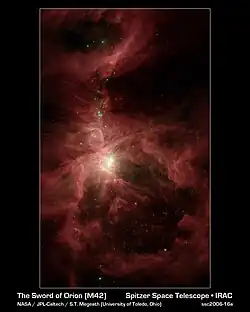 "This infrared image [at right] from NASA's Spitzer Space Telescope shows the Orion nebula, our closest massive star-making factory, 1,450 light-years from Earth. The nebula is close enough to appear to the naked eye as a fuzzy star in the sword of the popular hunter constellation."[18]