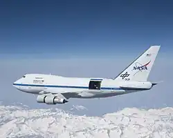 The Stratospheric Observatory for Infrared Astronomy (SOFIA) ... is based on a Boeing 747SP wide-body aircraft that has been modified to include a large door in the aft fuselage that can be opened in flight to allow a 2.5 meter diameter reflecting telescope access to the sky. This telescope is designed for infrared astronomy observations in the stratosphere at altitudes of about 41,000 feet (about 12 km). SOFIA's flight capability allows it to rise above almost all of the water vapor in the Earth's atmosphere, which blocks some infrared wavelengths from reaching the ground. At the aircraft's cruising altitude, 85% of the full infrared range will be available.[74] The aircraft can also travel to almost any point on the Earth's surface, allowing observation from the northern and southern hemispheres.