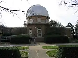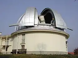 "The 300 square meters sized observation platform [at the Munich Public Observatory shown at right] is located at an altitude of 35 meters above street level and provides a splendid view over the city of [Munich] and the Alps. Two telescope domes [and] two smaller huts, housing the large telescopes are located here. In addition to these the visitors can use a series of smaller, portable telescopes."[73]