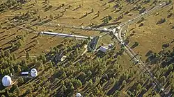 The Russian Okno system, four towers are at left, is an optoelectronic system for monitoring and surveillance of space objects integrated to the KRONA system of space recognition.