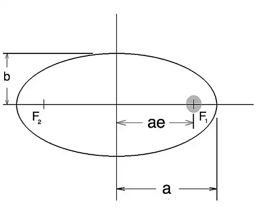 Figure 1 shows the geometry and characteristics of an elliptical orbit. F1 and F2 are called the focal points of the ellipse, a is called the semi-major axis, b is the semi-minor axis, and e is the eccentricity. For every orbit, the body being orbited is at one of the focal points of that orbit. For example, the sun is at a focal point of the Earth's orbit, and the Earth is at a focal point of the International Space Station's orbit. The distance between the center of the ellipse and either focal point is equal to the product of the semi-major axis and the eccentricity. For an ellipse, the eccentricity is between 0 and 1. For the special case where e is zero, the orbit geometry is a circle. A circle is an ellipse with a = b and both focal points in the same location.