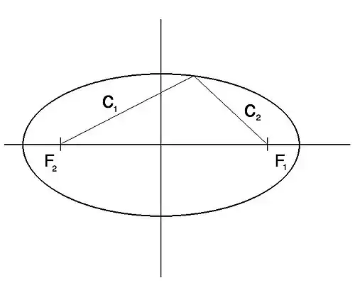 For every ellipse, the sum of the distance between every point on the ellipse and each focal point is a constant value. This is illustrated in Figure 2 for a particular point. The following is true for an ellipse: