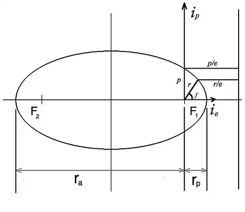 Figure 3 introduces many important parameters for elliptical orbits. The perifocal frame is defined by ie, ip, and with the third axis, ih, pointing out of the plane of the figure. Periapsis, designated by rp, is defined as the point in the orbit closest to the orbited body. Apoapsis, designated by ra, is defined as the point in the orbit farthest from from orbited body. There are specific terms that may be used in place of periapsis and apoapsis that are dependent on the body being orbited. For example, for orbits about the sun periapsis is called perihelion and apoapsis is called aphelion; for orbits about the earth periapsis is called perigee and apoapsis is called apogee.