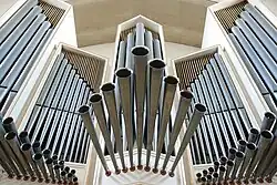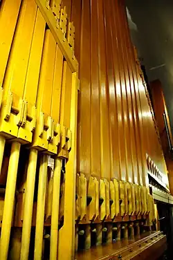 Principal stops are the backbone of the organ. They do not imitate any orchestral instrument. In essence, they are what makes an organ sound like an organ. They come in a variety of tonal "colors" and are most commonly used in hymn singing. Principal stops are available in a variety of pitches; the most common are 32', 16', 8', 4', 2 2/3', 2', 1 1/7', & 1 1/3'. As with all organ stops, there are several names for principals in several languages. The most common include Principal, Diapason, Open Diapason, Octave (for higher pitched stops), Prestant, Montre, Fifteenth (2' pitch), Super Octave, etc. Also grouped with the principal stops are "Mixture" stops. These high-pitched compound stops serve to clarify melodic lines or to make it easier to activate multiple ranks of pipes using a single drawknob or tab. Mixtures are unique in that they utilize several ranks and their harmonics don't progress like other stops. Often the pitch of a mixture stop will remain relatively constant between octaves. This phenomenon is best seen by playing scales using just a mixture stop. Mixtures can be denoted at the console by a roman numeral indicating the number of ranks the mixture utilizes. Common mixtures include Mixture, Plein Jeu, Fourniture, Scharf(f), Sharp, Cornet (a compounding of principal stops), Acuta, etc. When the full principal chorus is used, consisting of (16',) 8', 4', (2 2/3'), 2', (1 3/5',) (Mixture(s)), it is often referred to as "Plenum" registration (or "Organo Pleno"). Principal pipes are usually made of metal, but can also me made of wood. Metal principal pipes often made up the façade of an organ.
