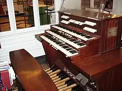 English consoles tend to be most similar to American consoles in that they often conform to AGO standards and they utilize similarly shaped drawknobs. There are, however, a few differences. The first is the music rack. English consoles usually employ a solid wood music rack that is mounted within the console and is in a fixed position. Small brass clamps are often found near the bottom to secure the music. This arrangement adds to the height of the console, making is difficult to see over the top, especially with large consoles. Also, it is not practical to employ a roll top, so most consoles are open, though a few have glass doors than enclose the manuals and jambs. Furthermore, there tends not to be enough room on the nameboard for rocker tabs, so all of the couplers are usually controlled by drawknobs. The drawknobs themselves are traditionally all white, though this is certainly subject to variation.