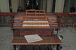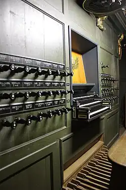 A keydesk is simply a console that is a part of the organ case This style can be seen in nearly every country where organs are prominent, but nowhere is it more common than in south-central Europe. Keydesks were the original organ consoles, which makes sense because the early mechanical action instruments would have had to keep things compact. Having the console as part of the organ case was a very effective way of doing that. What makes these types of keydesks unique, though, is their size and configuration. They were designed to accommodate a registrant (or two), a person who manipulated the stops for the organist. The stops were to large and heavy for the organist to manipulate quickly, so extra help was necessary for these instruments. The larger keydesks of this style have stops extending several feet away from the organist.