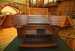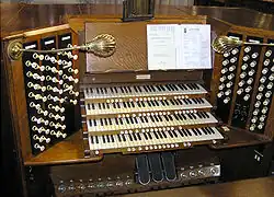Organ consoles in the United States and Canada tend to display similar design characteristics. For one thing, AGO standards are nearly always adhered to, meaning that manuals have 61 keys, pedalboards are concave and radiating with 32 pedals. These consoles usually have some sort of music rack that is attached to them. These are made of wood, glass, plexiglass, or some combination thereof and can be fixed or fold into the console to cover the manuals or fold back and latch onto the top of the console. Another common feature of the American console is the presence of some sort of rolling cover for the manuals and stop controls. Aside from that, though, there are two primary styles within this category, which are based upon the types of stop controls being used.