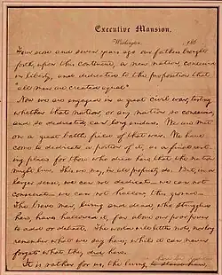 | This draft was given to Lincoln's other secretary John Hay. The Hay copy, which is sometimes referred to as the "second draft," was made either on the morning of its delivery or shortly after Lincoln's return to Washington. |