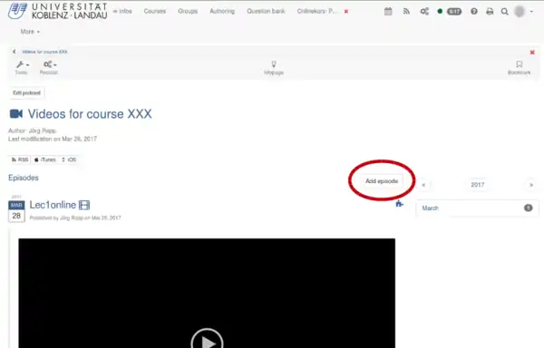 Now you are delivered to a window, in which you can upload the episodes of your podcast. A episode is a single video of your lecture, e.g. the video for lecture 1