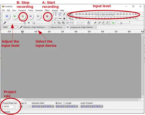 It is recommend to use the audio editor and recorder software Audacity. Audacity supports Linux, Windows and OS X and can be downloaded for free.