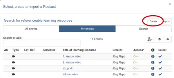 In the menu bar on the left side a new button appears called „Podcast“, in the main frame of OLAT you have different tabs like „Title and description“, „Visibility“, „Access“, „Podcast learning content“ and. Choose the settings you want to use for this course element. The following steps are for the case if the video you want to use in your OLAT course was never used before in OLAT.