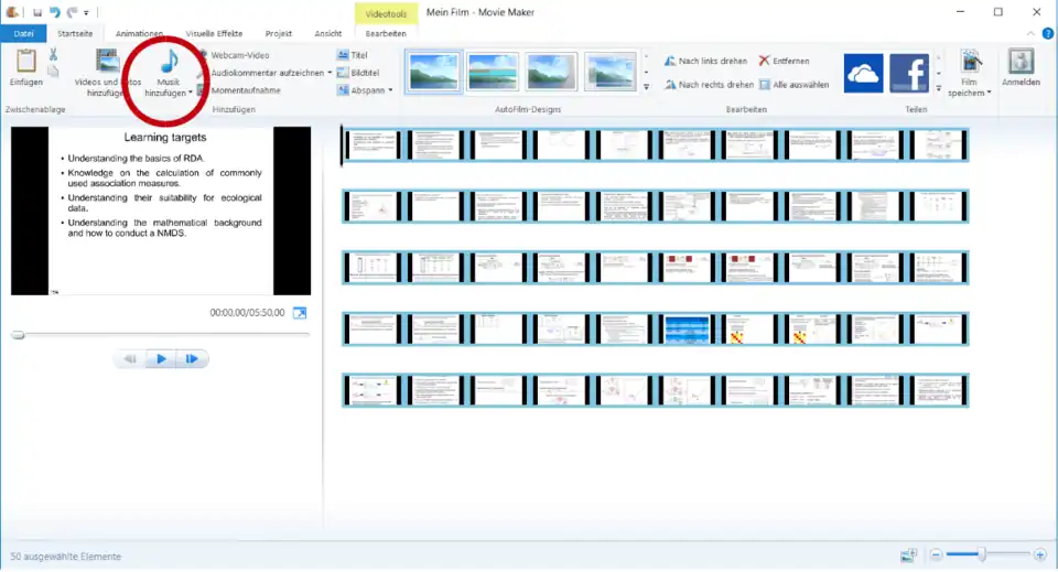 - Export the created video with a appropriate resolution (Datei → Film speichern → Youtube)and select a name for your video file and the folder in which your video file should be saved