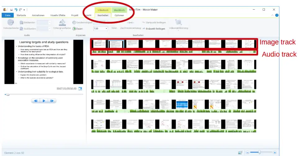 After the import of the images and the audio files two new tabs appear in the toolbar. With a mouse overlay over a image or over an audio track the name of the image is displayed as well as the duration. Now, the duration of each image has to be adjusted to the duration of the audio files.