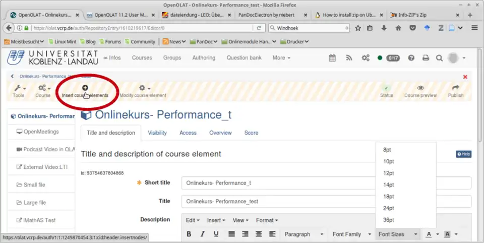 Log in into OLAT and select the course in which you want to implement the HTML presentation. First, a course element called single page has to be added to the course.