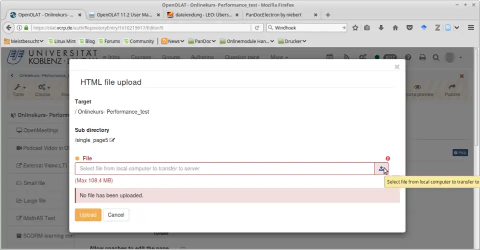 The zip file is now uploaded into the internal OLAT storage folder and decompressed automatically. A new window called „Select HTML file“ appears.