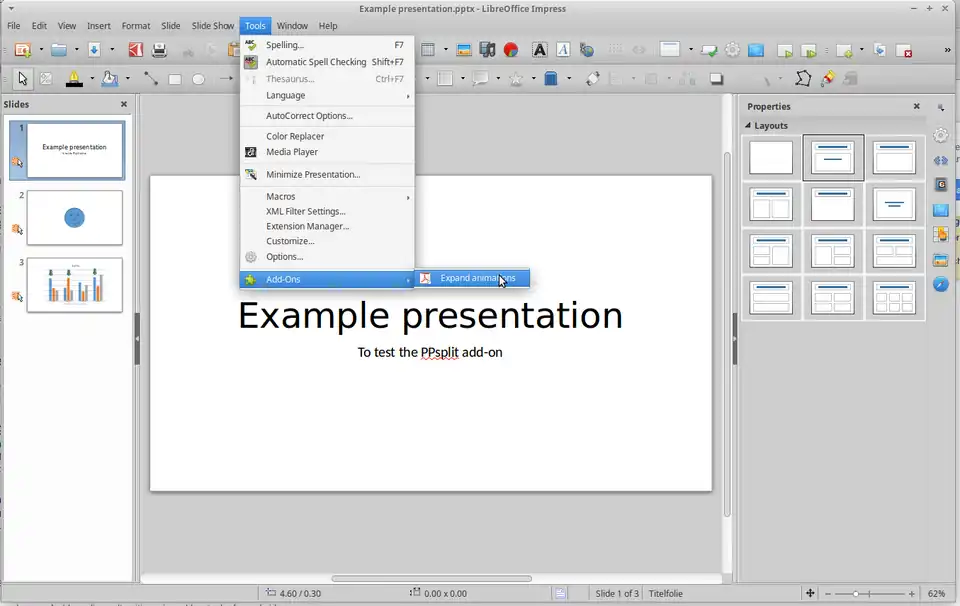 After executing this command you will find 2 new documents in the folder, in which the original presentation is stored, a PDF and a odp file, both with the filename supplement „expanded“. Both contain slides with each on click-triggered animation step on a single slide.