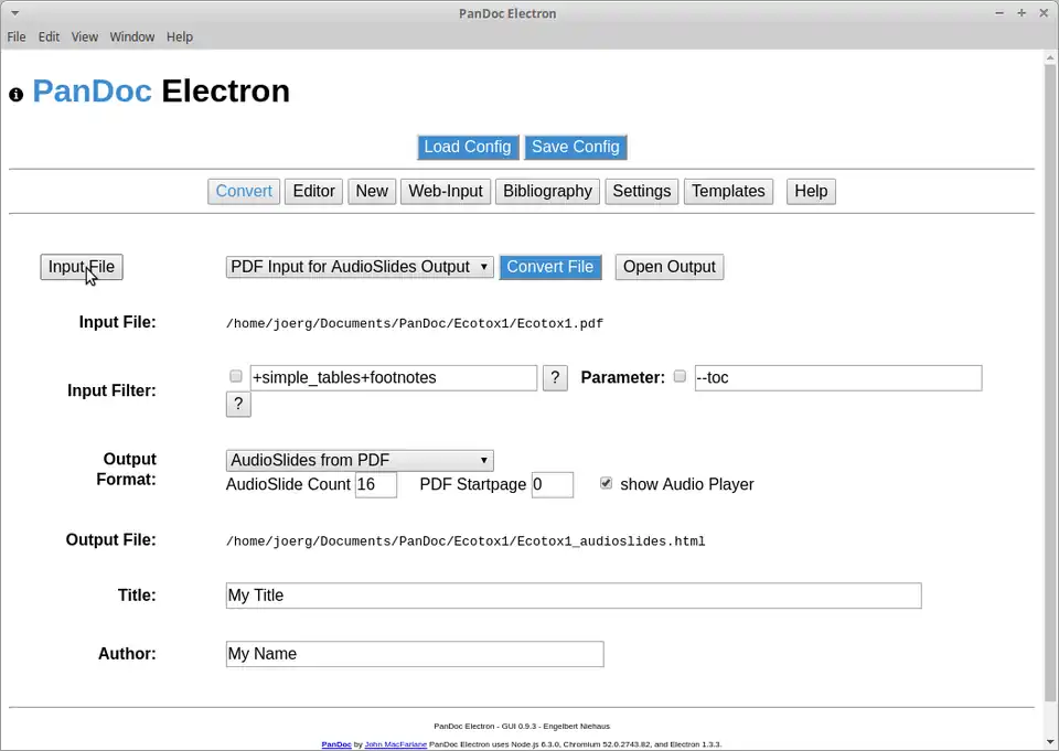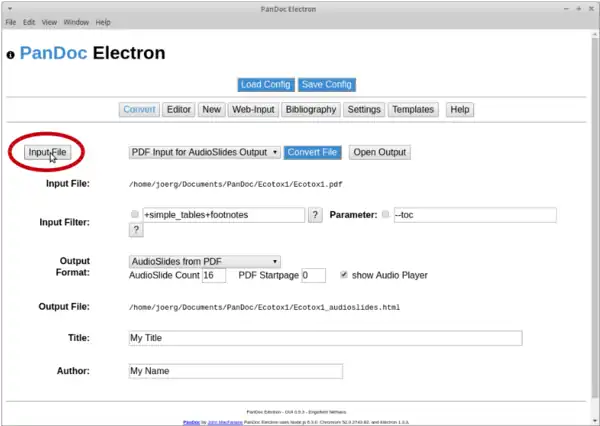We will use the software tool PanDocElectron together with additional software tools to convert the generated PDF file into a HTML presentation. PanDocElectron is able to use different input formats, like PDF, Markdown, wiki markup etc. and converts them into the wished output format, like HTML audioslides, LaTeX, odt etc. .