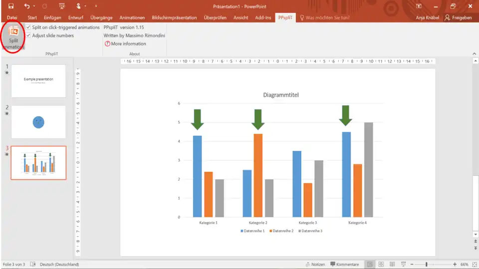 - Press the Button „Split animations“ (the checkbox „Split on click-triggered animations“ has to be activated).