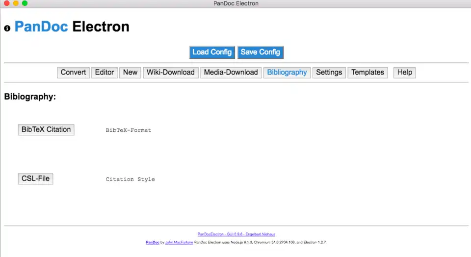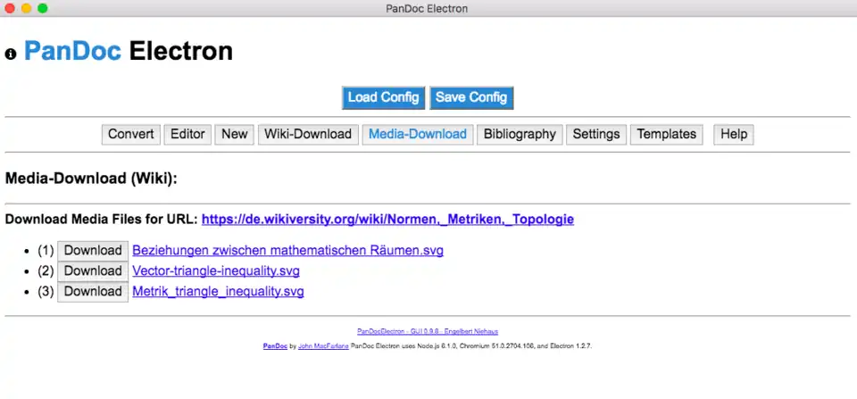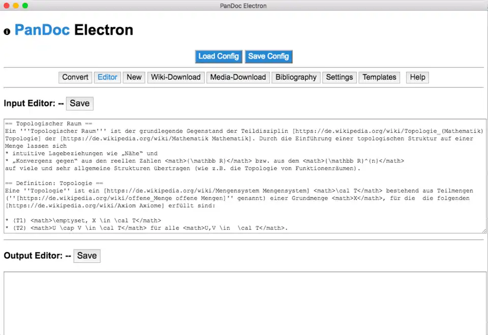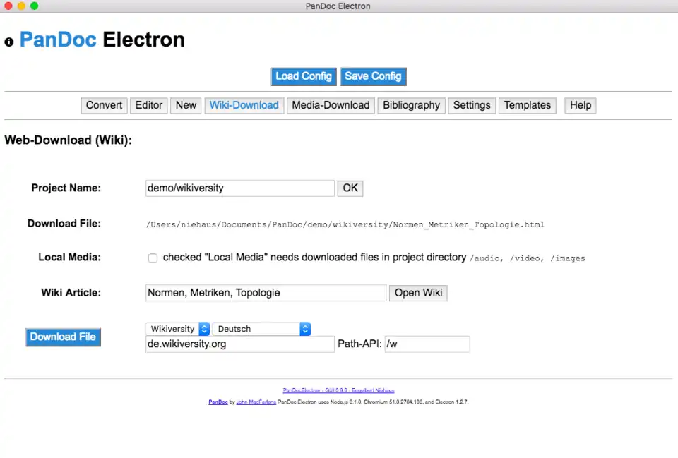 PanDocElectron Screenshot - Select Input File, Output Format and press ConvertSelect Wikiversity Article and Download ContentMedia Download for Offline Use of Wikiversity PresentationsPanDocElectron Settings - Path to installed softwareSet BibTex Files for Citations and Citation Style - e.g. APAPanDocElectron Editor for Input and Output File - before and after convert