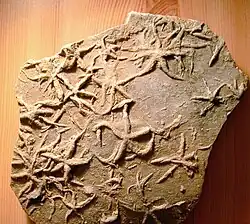 - Invertebrates - The Triassic period emerged from the Great Dying of the Permian, an extinction event that decimated life on Earth, providing opportunity for the surviving life forms to adapt and for new forms to evolve. Bivalves, ammonoids and brachiopods survived the Permian-Trassic extinction and dominated invertebrate life of the Triassic, becoming extremely complex and diverse throughout the Triassic and into the Jurassic. New life forms also begin to appear in the fossil record including the squid like coloeids as well as echinoderms, resembling modern day starfish and sea urchins. Small coral and sponge reefs appear in the shallow warm seas along the equator in the Tethys Sea but there is no evidence that they existed in mass as we see today. Also missing from the fossil record are phytoplankton which we know are so important to sea life, but this missing record is likely from a lack of fossilized preservation of their soft-bodies. Arthropods were likely abundant during the Triassic because they are found in both the Permian period preceding the Triassic as well as the later periods, the Jurassic and Cretaceous, of the Mesozoic. The lobster and crab crustaceans also make their first appearance during the Triassic.[10][11]